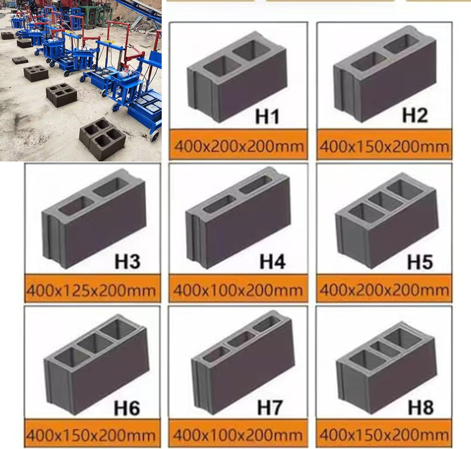Customizable Brick Sizes: The machine includes 8 interchangeable molds (H1–H8) to produce standard 16"×8"×8" (400×200×200mm) hollow bricks with 1–2 holes. from sidewalk pavers to fire pit walls—by swapping molds quickly.